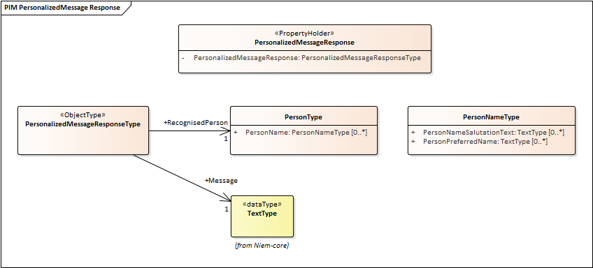 When describing the MPD earlier, we referred to a PropertyHolder that contained the possible document roots for our two messages. Now that we have defined our subset Packages we can define these document roots. Because we are only creating two simple document types, all that is needed is a PropertyHolder and ObjectType for each message. The ObjectTypes link to the types we've selected from the NIEM framework, to describe the contents of each message as shown: