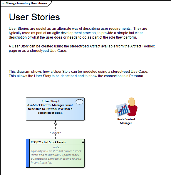 Enterprise Architect is an open platform that supports any requirements engineering process. The tool has a rich feature set and is highly configurable, and its flexible design means that whatever method is being used the modeler will find features to help. So whether the team is using Formal requirements, Use Cases, User Stories or Story-Boards in any combination, Enterprise Architect can be used to develop, manage and document the requirements. The implementation of the UML extension mechanisms means that any type of requirement can be created and managed using built-in types or by using stereotyped elements and Tagged Values.
