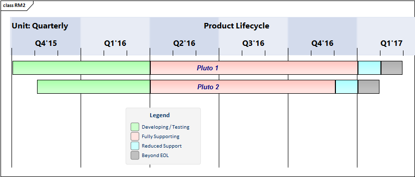 This diagram shows an example Roadmap that documents the planned lifecycle for two products through development, release, support and retirement, by quarter over a period of one and a half years.