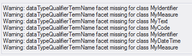The Schema Composer performs specific validation for a technology should one be assigned. This image shows warnings about missing Tagged Values for Classes in a schema built on the UN/CEFACT Core Components standard.