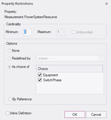 Where generalizations of a property type are present in the schema, those subtypes will be available as choice elements in the 'Restriction' dialog.