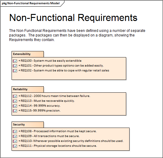 Quality Attributes are often grouped into sets such as those pertaining to Security or to Performance or one of the '-ilities' such as Reliability. A requirements Package can be used to group these elements together which provides a convenient categorization for reporting. The Packages can be seen in the Project Browser and can also be added to a diagram with the option to display the individual Requirements inside the Package.