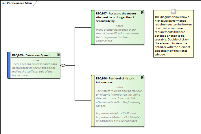 Enterprise Architect conveniently has a number of Requirements such as the Non Functional, Architecture, Implementation and Security Requirement types available from the 'Extended Requirements' page of the Requirements Toolbox. These can be dragged onto a diagram or created directly in the Project Browser or Specification Manager.