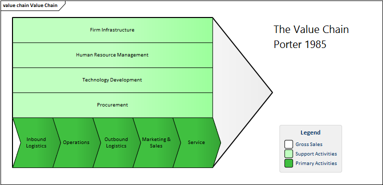 Enterprise Architect is able to link each activity in the Value Chain to support documentation, including budgets and benchmark results. The ability to link to competitors' websites and web based market information extends the power of the Value Chain beyond a traditional text based model.