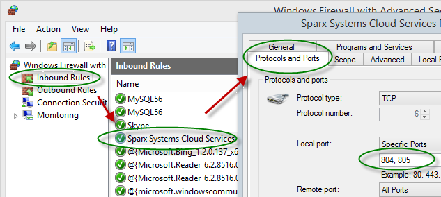 For information on creating the Inbound Rule to identify the ports you have specified in the config file (the 'Sparx Systems Cloud Services' rule in the illustration), see the Windows online topic Create an Inbound Port Rule.
