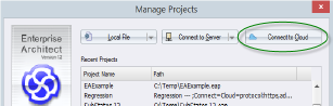 Once your Cloud Service has been set up with at least one port listening for communication and at least one model you can connect to, you can connect to the model in Enterprise Architect. When you first open Enterprise Architect, the 'Manage Projects' dialog displays. The on the top right provides access to Cloud connections.