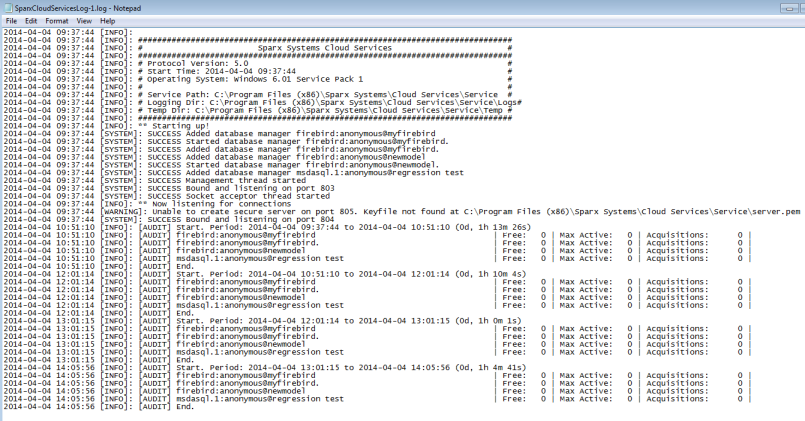 When a Cloud Server is initially started, it writes the list of available models to the log file. For each model you have added, you should see a line such as: [SYSTEM]: SUCCESS Added database manager msdasql.1:anonymous@mymodel If the log file is missing any lines, or if the message doesn't read 'SUCCESS' this might indicate a problem with the model connection. |