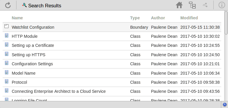The results provide the object name, type, author and last-modified date of each object that matches the search criteria. If you click on an item, the 'Properties' view will be loaded for that object.