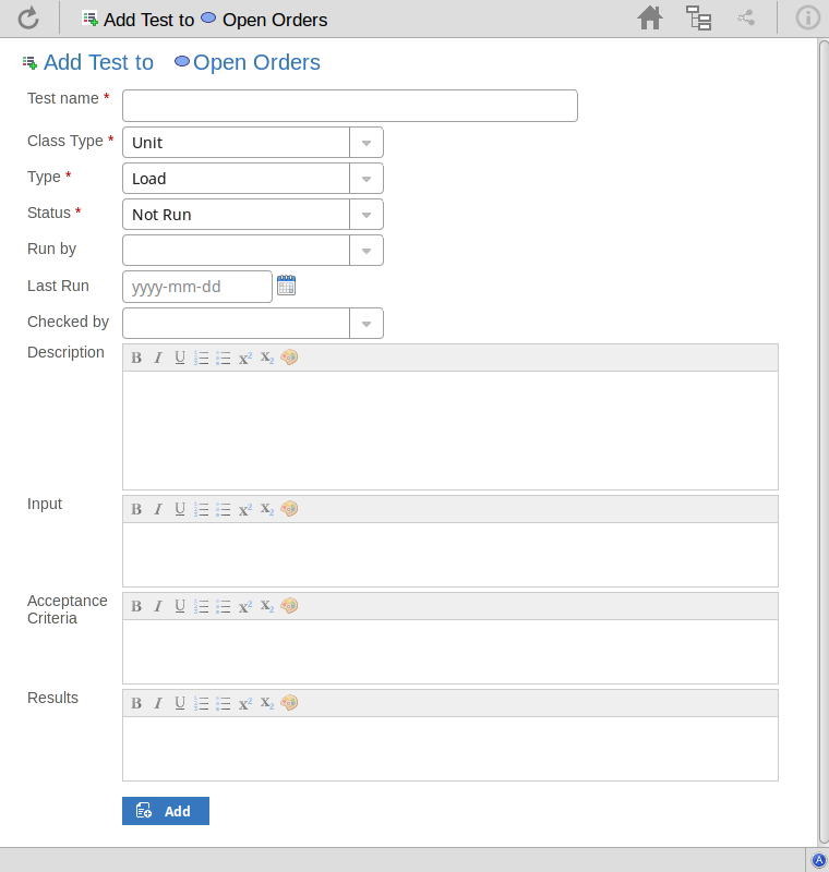 Click on this button to submit the details and create the Test record on the selected element. This message is displayed: Test <name> was successfully added to <element name>. Either: