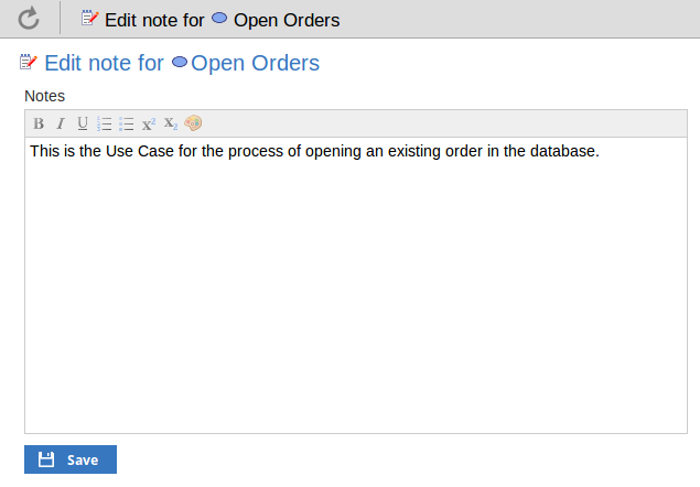 Within any model in which you have the security permissions to create elements, you can also edit the Notes, Resource Allocation and Testing details of any object in which they occur. On the right of the item field for these three properties you will see a