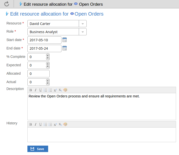 If necessary, edit the description of the resource allocation, perhaps to explain the changes you have made to earlier fields. You can format this text using the facilities provided in the Notes toolbar, as explained in the Edit Notes section. Before changing the text, you might want to copy it to paste into the 'History' field for editing there. |
