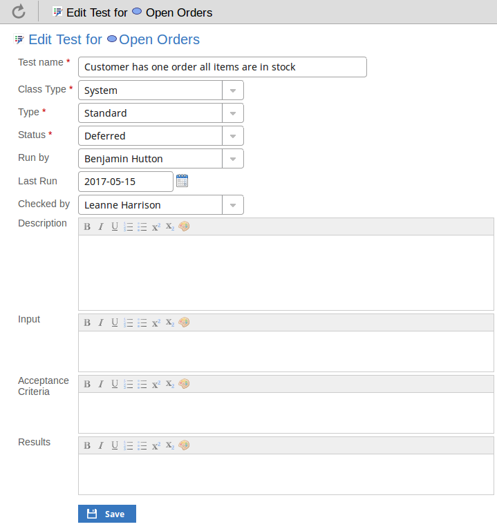The tests assigned to an element support a range of situations including user acceptance and scenario. You could be asked to define or perform tests on parts of a model of relevance to you as a customer or user, or you might want to add information obtained from other people you have asked to perform an evaluation. Therefore, you might need to edit test records to update them with your information.