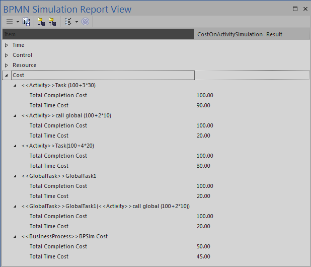 • Total Completion Cost is 100, matching the FixedCost (100) on GlobalTask1 setting in BPSim