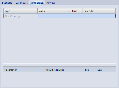 The BPSim Perspectives have four pages, or tabs, of data in common. These are the 'Scenario', 'Calendars', 'Properties' and 'Review' tabs, the first three of which are also reflected in the data hierarchy on the left of the window. The data specific to each Perspective is discussed in separate topics.