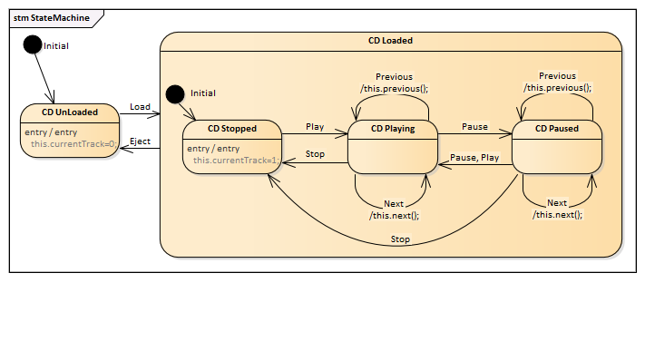 - On the higher level, the StateMachine has two States: CD UnLoaded and CD Loaded