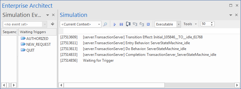 In this section, we will create a Class called TransactionServer, which defines a StateMachine as its behavior. We then create an Executable StateMachine Artifact as the simulation environment.