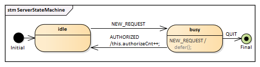 - Back to idle, with the trigger AUTHORIZED, with the effect "this.authorizeCnt++;"