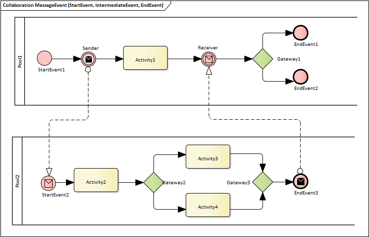 - EndEvent3 sends the message to the 'To' participant (Pool1, Receiver)