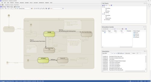 Model Simulation brings your behavioral models to life with instant, real-time behavioral model execution. Coupled with tools to manage triggers, events, guards, effects, breakpoints and simulation variables, plus the ability to visually track execution at run-time, the Simulator is a powerful means of 'watching the wheels turn' and verifying the correctness of your behavioral models. With Simulation you can explore and test the dynamic behavior of models. In the Corporate and above editions, you can also use Javascript as a run-time execution language for evaluating guards, effects and other script-able pieces of behavior.