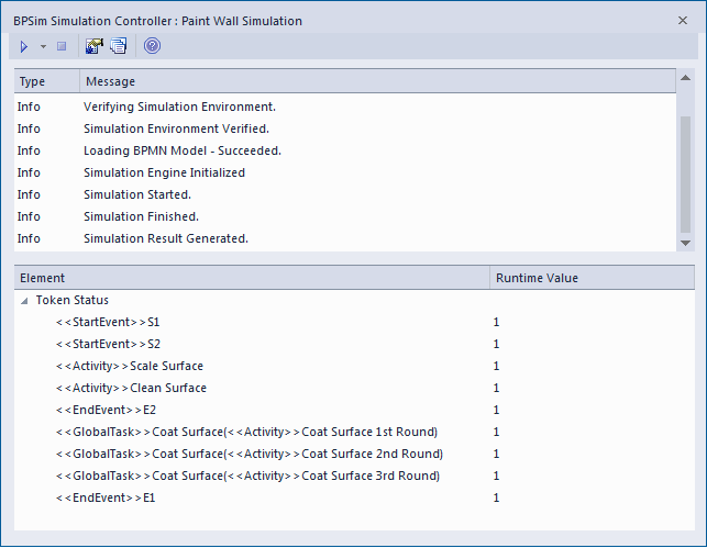 - On the 'Configure BPSim' dialog toolbar, click on the ; the 'BPSim Simulation Controller' dialog displays