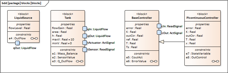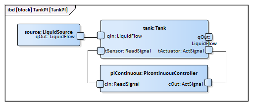 LiquidSource - The water entering the tank must come from somewhere, therefore we have a liquid source component in the tank system, with the property flowLevel having a unit of 'm3/s'. A Port 'qOut' is typed to 'LiquidFlow'. Tank - The tanks are connected to controllers and liquid sources through Ports.