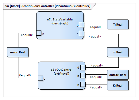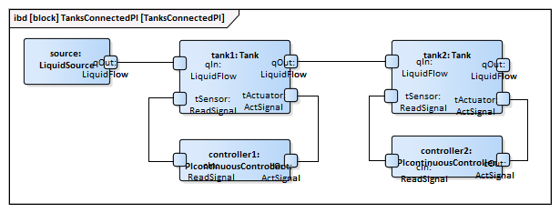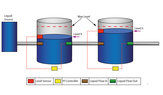 This diagram depicts two tanks connected together, and a water source that fills the first tank. Each tank has a proportional–integral (PI) continuous controller connected to it, which regulates the level of water contained in the tanks at a reference level. While the source fills the first tank with water the PI continuous controller regulates the outflow from the tank depending on its actual level. Water from the first tank flows into the second tank, which the PI continuous controller also tries to regulate. This is a natural and non domain-specific physical problem.