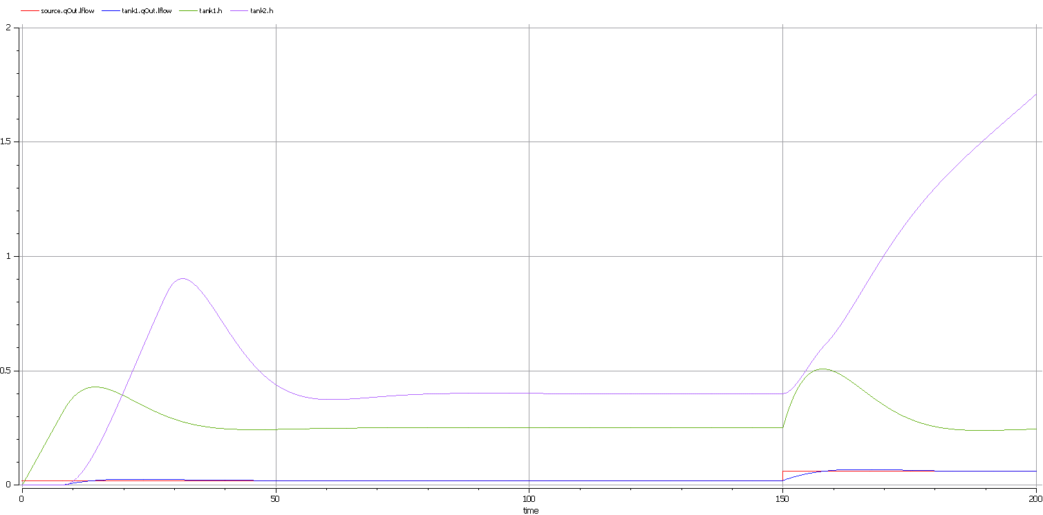 - Both tank1 and tank2 regulated twice during the simulation; the first time regulated with the flow level 0.02 m3/s; the second time regulated with the flow level 0.06 m3/s