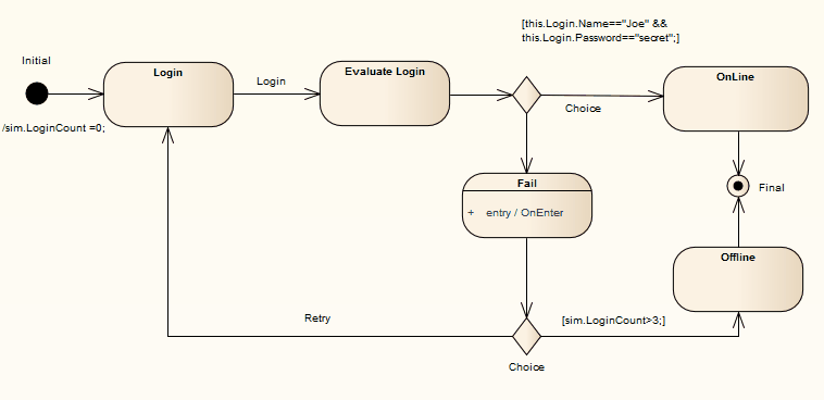 This is an example diagram that makes use of trigger parameters. At the Evaluate Login state, the simulation examines the variables passed in as trigger parameters and makes a decision to either accept the credentials or deny them.