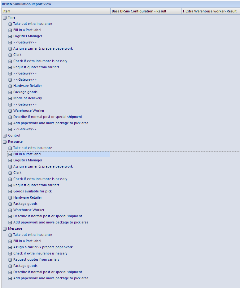 The results of the simulation are written to an Artifact element added to the Business Process parent Package. A Standard simulation writes to a <<BPSimReport>>-stereotyped Artifact, whilst a Customized simulation writes to a <<BPSimCustomReport>>-stereotyped Artifact.