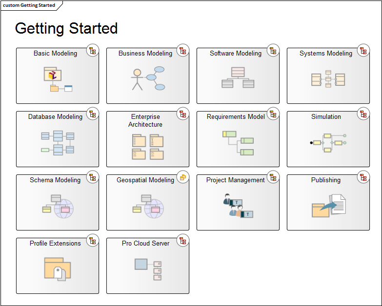 If you subsequently decide to change or remove the image in a Navigation Cell, right-click on the element and select the 'Appearance > Select Navigation Image' option. The 'Select Image' dialog displays, and you can simply click on a different image or - to just remove the existing image - click on the Cancel button. Selecting the 'Navigation Cell' option also enables the 'Run auto layout' checkbox, which you can select to automatically adjust the layout of the Navigation Cells to form a grid with 10 units of separation between cells. (The unit is defined in the diagram Properties). If you do not want to adjust the layout of the cells, clear the checkbox before clicking on the OK button. When a diagram user double-clicks on the Navigation Cell, the target diagram that it represents is opened and displayed. Navigation Cells are an excellent tool for creating a 'Home' page for a project or website, as illustrated by the default model diagram for the Sparx Systems Example Model.