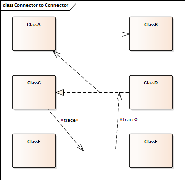 Under certain circumstances, it can be useful to create a connector that issues or terminates (or both) on another connector. For example, you might create a connector between two elements, and then create a link between that connector and a Requirement element to show that the relationship between the two elements was a predefined specification of the design.