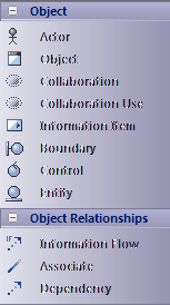 Except where discussed here, each element and relationship that you can create using these Toolbox pages is described in the UML Elements and UML Connectors sections of the Help. A Boundary is a stereotyped Object that models some system boundary, typically a user interface screen. A Control is a stereotyped Object that models a controlling entity or manager. An Entity is a stereotyped Object that models a store or persistence mechanism that captures the information or knowledge in a system. |