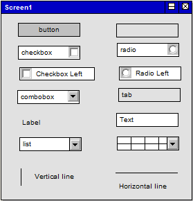Except where discussed here, each element and relationship that you can create using these Toolbox pages is described in the UML Elements and UML Connectors sections of the Help. The Screen element represents the screen or dialog frame in a graphical user interface. You can identify fields, delimiters and buttons on the screen using the different UI Control elements. UI Control elements are different stereotyped elements defining controls such as buttons, fields and combo boxes. You arrange these on the Screen element, as part of a User Interface diagram, to define a screen or dialog in a user interface. |