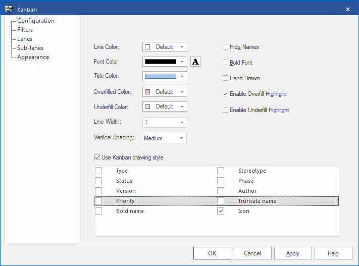Using the 'Appearance' page, you can set the Kanban diagram appearance options such as the line and font colors and use of the Hand Drawn mode.