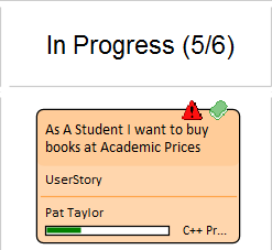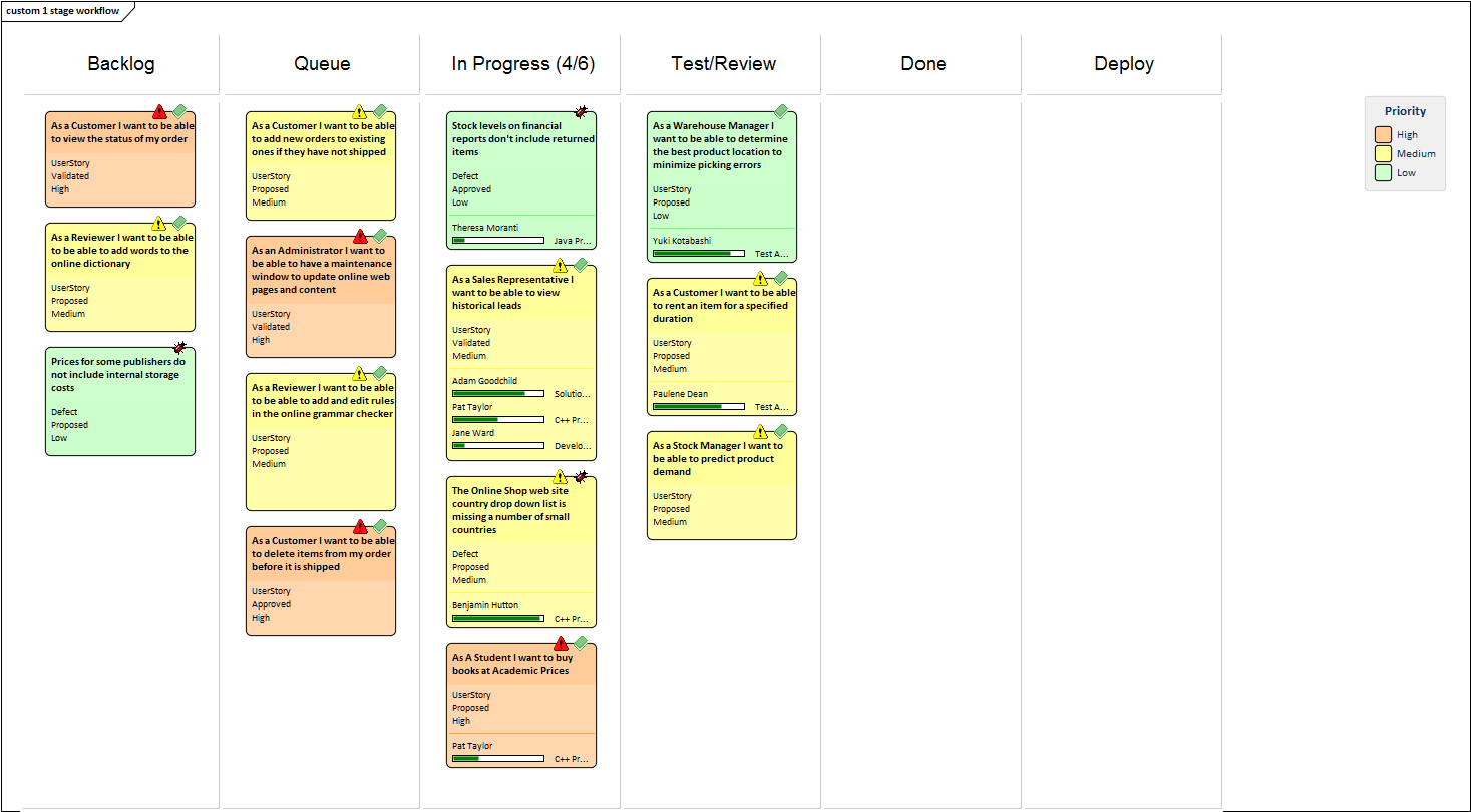 The Kanban cards can be configured to display an extensive set of properties, with compelling icons, colors and progress bars to communicate the important aspects of the work item, resource allocation and work item progress. The properties include the item name, type, status, version, priority, stereotype, phase, author and more.