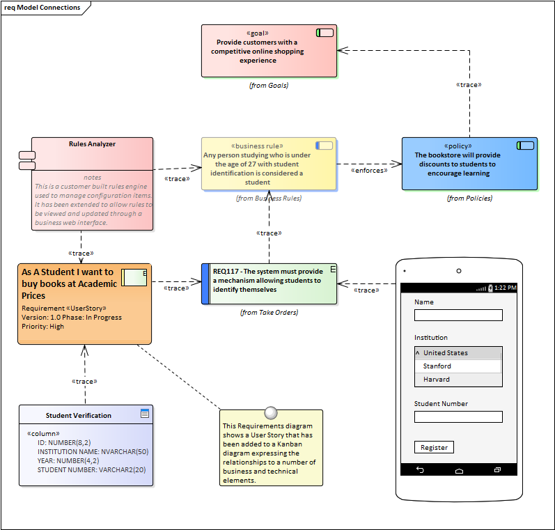 There are a number of commercial tools that allow Kanban to be used to manage projects visually, but Enterprise Architect’s Kanban facility is incredibly powerful because the tool is also a sophisticated modeling platform for strategic and business analysis, architecture, design, implementation, testing and deployment. This means that work items on a Kanban Board can be linked to strategic decisions, business rules, policies, requirements, architecture and design elements, wireframes and UX models, programming code, database tables, procedures, tests, virtual or physical deployment nodes, and more. For the first time everyone in the team can collaborate in the same environment using a toolbox of facilities purpose built for their discipline, while at the same time being able to visualize and manage the value being delivered to the customer in a powerful and visually compelling set of Kanban boards.