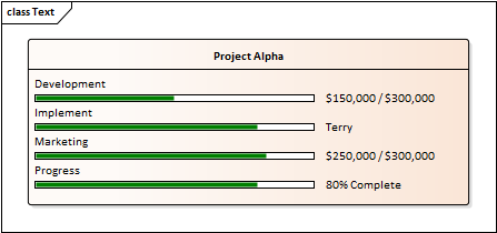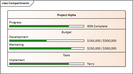 By default, progress bars in an element display together in a separate compartment from other types of Tagged Value (provided that the diagram and/or element are set to display tag compartments). When there are several progress bars on an element, each relating to a different factor of the project, it can become harder to distinguish between them. In these cases it is possible to set the progress bars to display in specific compartments in order to increase clarity. This also provides an additional level of labeling. So you might have an element relating to costs, and two or more compartments that indicate costs of different departments, where the department name is reflected in the compartment name. Or compartments that each contain two or more progress bars indicating, say, the costs and percentage completion of tasks in each department.