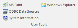 The 'User Tools' panel provides access to a series of external tools useful to you while working on the model. MS Paint is a simple but useful drawing tool; Windows Explorer can be useful when working with importing and exporting content from the model, including CSV files for exchange with a spreadsheet tool, XML Schema files, Database and Source code files and the generation of Documentation. Open Database Connectivity (ODBC) settings can be accessed to assist when working with live databases, and system information can be viewed. |