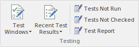 The 'Testing' panel is used for creating and managing all aspects of testing. The Testing window conveniently collects all the tests for an element, and allows new tests to be created and existing ones to be managed. The tests can be fully described and Inputs, Acceptance Criteria, Results, Status and more can be defined for each test. There are several predefined searches that can be run to find recent test results, such as the recent test that have passed. A configurable Test Report can also be generated, creating a single document that describes all tests or any combination of tests. |