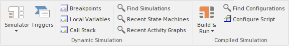 The 'Dynamic Simulation' panel brings together a range of tools for working with Behavioral Model simulations. It provides access to a range of windows that allow you to control a simulation, set up simulation triggers and signals, set breakpoints, inspect local variables or view the Call Stack. It also offers a number of pre-defined model searches for retrieving recently modified state machines and activity graphs. |