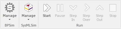 The 'Run' panel provides a number of buttons to control execution of the active simulation, such as Start, Pause, Step-in, Step-over, Step-out and Stop. |
