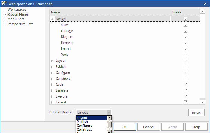 To redisplay a panel or ribbon, select the corresponding 'Enable' checkbox. Selecting a panel within a hidden ribbon shows the ribbon again. Selecting to show a hidden ribbon selects the checkboxes against all its panels; you can then clear individual panels as required. If you have cleared a number of ribbons and/or panels, you can restore the complete set of ribbons and panels by clicking on the . |