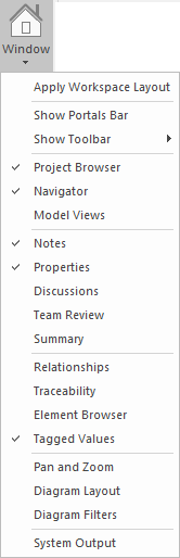 Select this option to display the Traceability window, which helps you to see what relationships an element has, and to follow the chains of relationships to see what might influence the design or content of an element or what that element might itself affect. |