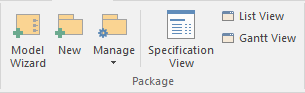 The 'Package' panel provides facilities to create and manage folders (Packages). New models can be added that typically contain a number of other Packages. These Packages form the structure of the model and can be used to group elements, diagrams or other Packages. A Package can also be viewed as a list of elements that will include other Packages, or as a Gantt chart describing the allocation of resources to the elements in the Package.