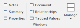 The 'Windows' panel provides access to a small collection of commonly-used windows; these are often referred to as 'docked windows' as they are typically docked around the edges of the workspace and provide information about the model and system activity. They provide a rich way of viewing information about elements as you navigate through them in diagrams or the Project Browser.