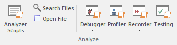 The 'Analyze' panel brings together a collection of powerful tools for analyzing the execution of an application. The tools available are a fully featured Debugger, an execution Profiler and a stack trace Recorder. There are also facilities for running the application and recording Test Point output, for subsequent analysis. The active Analyzer Script will determine the behavior of these tools, by specifying the commands that are executed as well as the settings and parameters for those commands.