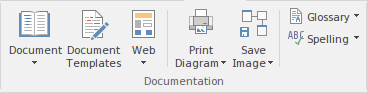 The 'Documentation' panel groups together a set of tools used to extract information from the model in a variety of useful formats, ranging from publications for corporate audiences to spreadsheets, XML schemas, patterns, Reusable Assets and much more. The model is the repository of valuable organizational information and knowledge, and people who don't access the model directly can still get access to this knowledge through this panel of tools. There are several documentation formats including docx, pdf and HTML, and schemas can be extracted for information exchange between divisions or separate organizations. There is also the facility to save parts of the model for reuse with the Pattern and Reusable Assert Server features.