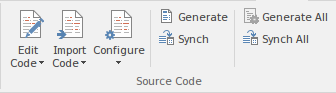 This icon provides a collection of tools for viewing and editing source code files associated with elements in the current model. Also provided are tools that generate source code for a particular element or synchronize an element to reflect changes in its associated source code file.