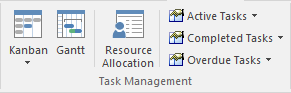 The 'Task Management' panel is a collection of tools for managing human resources and their allocation to elements that represent tasks to be completed. Kanban diagrams can be used to visualize boards of elements, and a Gantt chart shows the duration of assigned tasks and other important views. The Allocation window is used to assign resources to elements representing work to be done. There are several searches that list a variety of useful views, such as Overdue Tasks, Tasks Starting Today, and more.