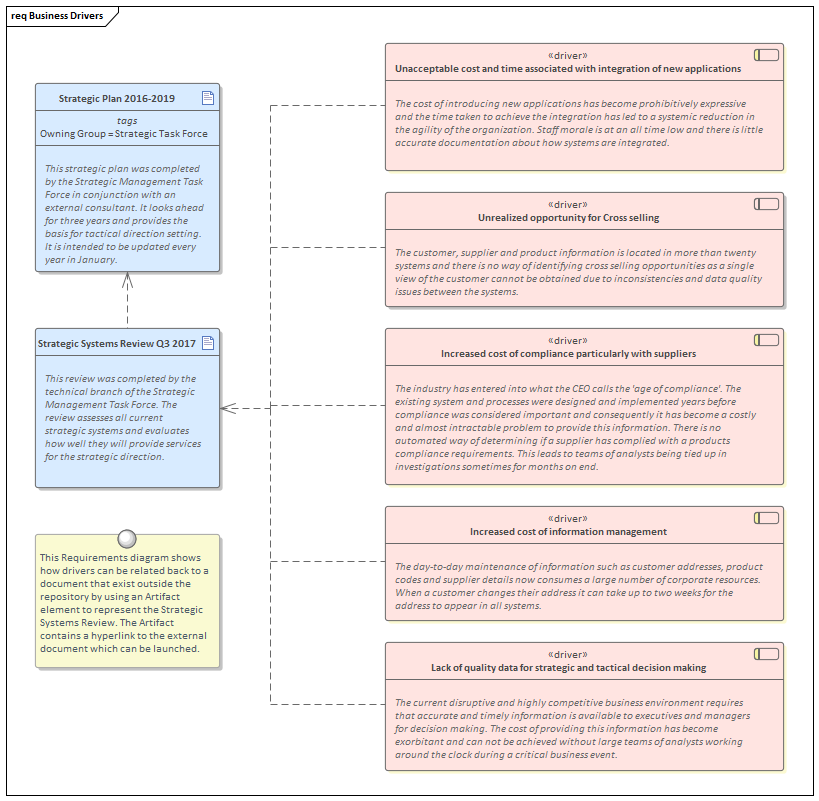 Enterprise Architect has support for modeling both strategic and tactical drivers with the use of a stereotyped driver element that can be linked to goals and other organizational elements to show how the organization must respond. They can also be linked through the Goal or Objectives to a stakeholder who can help validate that the Driver and its relationships to Goals, Constraints and Assumptions are correct. This should be done collaboratively and stakeholders can review the models directly in the repository or by looking at documentation that has been automatically generated from the models using built-in or custom templates.